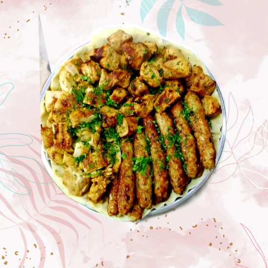 Шашлык из свинины 0,5 кг, шашлык из курицы (филе) барбекю 0,5 кг, люля-кебаб из курицы+баран 0,5 кг, картофель жареный по-домашнему 300гр, лаваш- 2 шт, оформление луком и помидорами 500р+ 500р залог поднос.