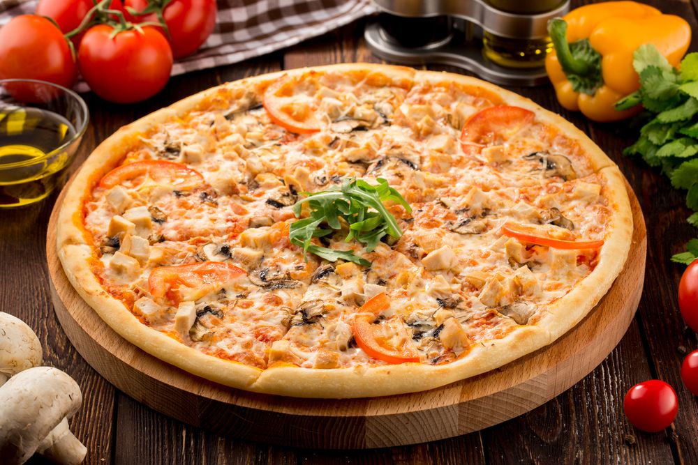 Пицца с курицей, грибами, сыром и овощами