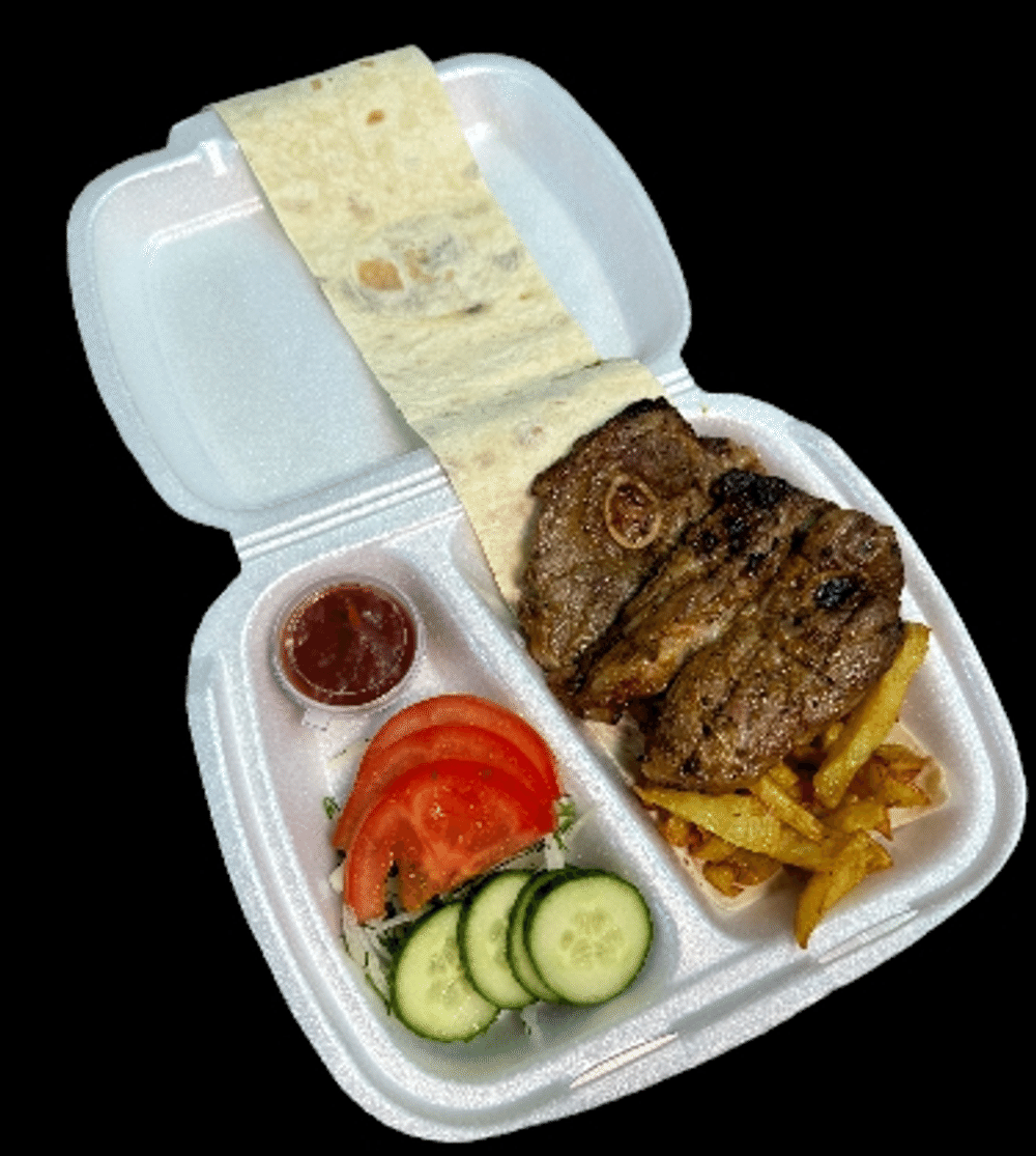 (Мясо, лаваш, лук, помидоры, огурцы, жареный картофель 70гр, соус)