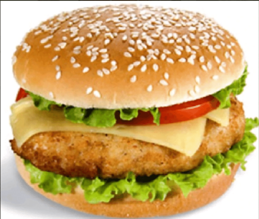 Булочка белая, котлета курино-говяжья, огурец свежий, лист салата, помидор, сыр, соус