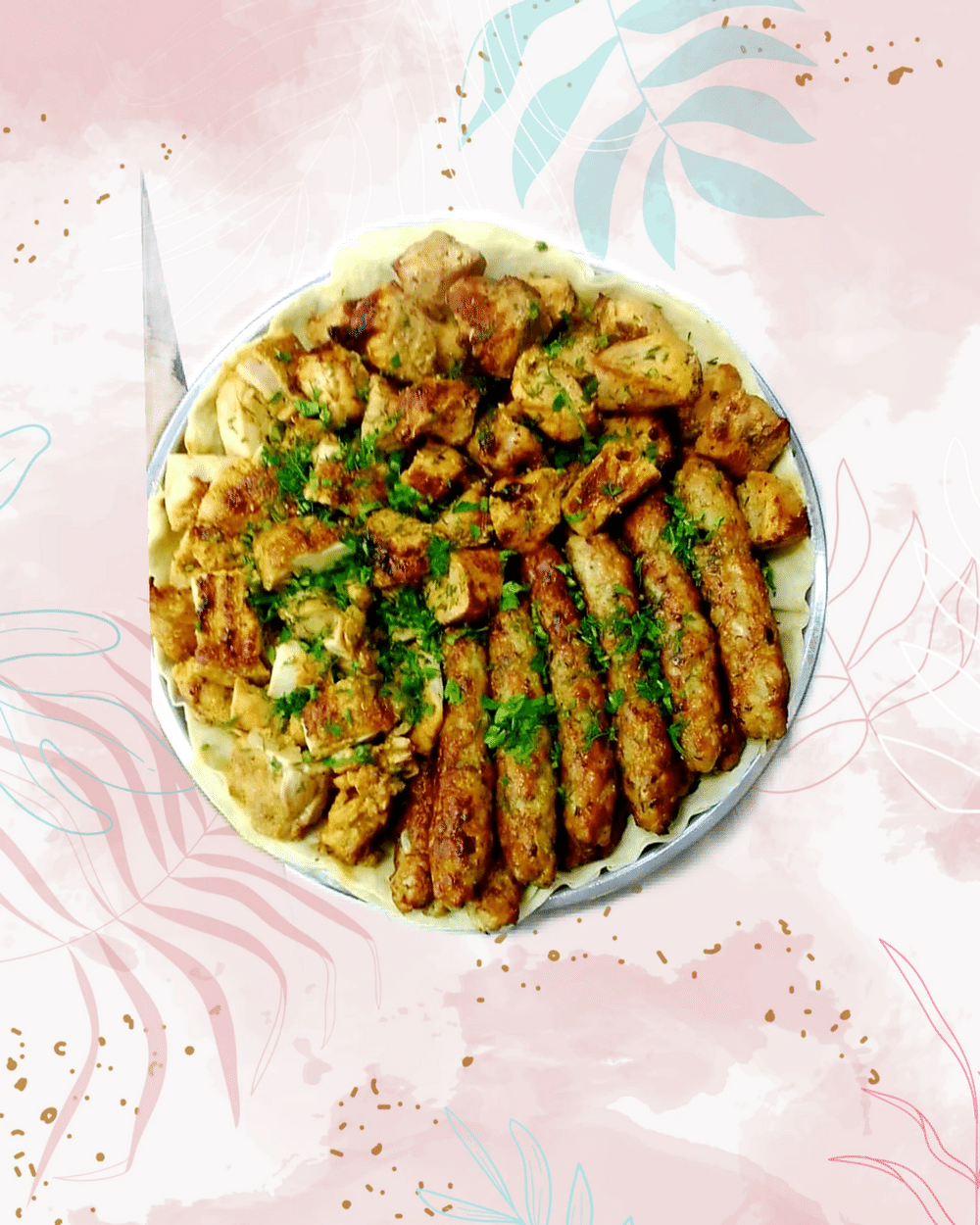 Шашлык из свинины 0,5 кг, шашлык из курицы (филе) барбекю 0,5 кг, люля-кебаб из курицы+баран 0,5 кг, лаваш- 2 шт, оформление луком и болгарским перцем 600р+ 500р залог поднос.
