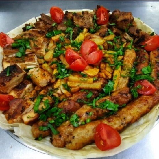 Шашлык из свинины 0,5 кг, шашлык из курицы (филе) барбекю 0,5 кг, люля-кебаб из курицы+баран 0,5 кг, лаваш- 2 шт, оформление луком и болгарским перцем 500р+ 500р залог поднос.